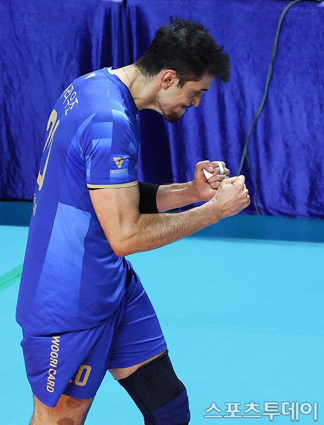 26일 서울 장충체육관에서 열린 2025-2026 V리그 남자부 우리카드와 현대캐피탈의 경기, 우리카드 아라우조가 득점하고 있다. 2025.11.26. [스포츠투데이 팽현준 기자 sports@stoo.com]