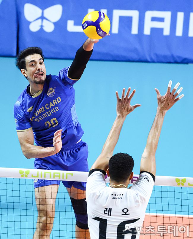 26일 서울 장충체육관에서 열린 2025-2026 V리그 남자부 우리카드와 현대캐피탈의 경기, 우리카드 아라우조가 공격하고 있다. 2025.11.26. [스포츠투데이 팽현준 기자 sports@stoo.com]