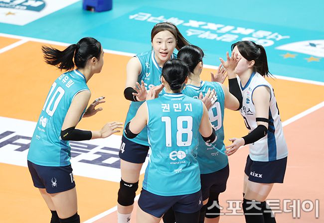 2025-2026 진에어 V-리그 여자부 GS칼텍스-페퍼저축은행 경기가 5일 서울 장충체육관에서 열렸다. GS칼텍스 선수들이 득점 성공에 기뻐하고 있다. 2025.12.05. [스포츠투데이 권광일 기자 sports@stoo.com]