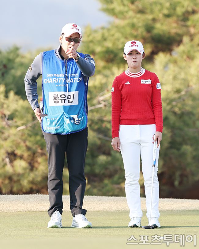 2025 백송홀딩스·부산일보 채리티 매치 (우승 1억 원, 준우승 2억 원) 이벤트 대회 2일차 경기가 7일 부산 아시아드CC에서 열렸다. 황유민이 9번홀 연장에서 퍼트라인을 확인하고 있다. 2025.12.07. [스포츠투데이 권광일 기자 sports@stoo.com]