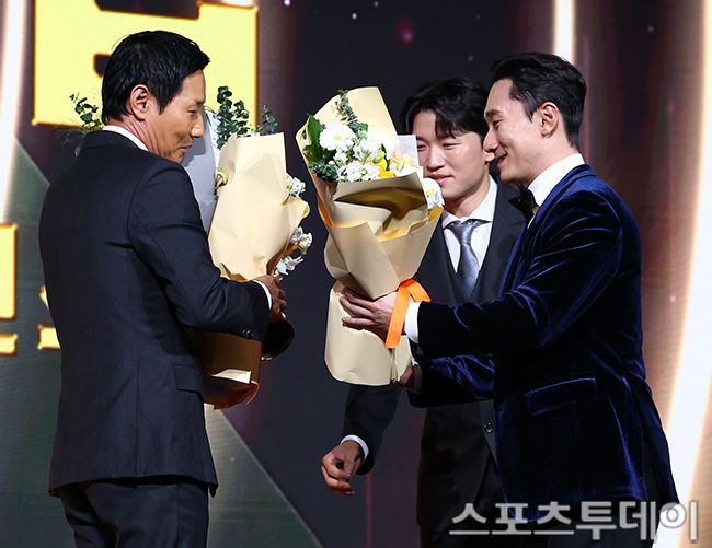 LG 염경엽 감독이 9일 서울 잠실 롯데호텔월드에서 열린 2025 KBO 골든글러브 시상식에서 올해의 감독상을 수상 후 박해민과 신민재의 축하를 받고 있다. 2025.12.09. [스포츠투데이 팽현준 기자 sports@stoo.com]