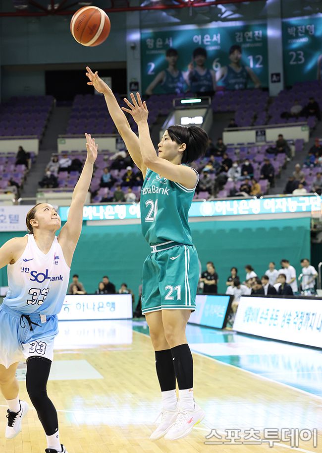BNK금융 2025-2026 여자프로농구 부천 하나은행과 인천 신한은행의 경기가 26일 경기도 부천시 부천체육관에서 열렸다. 하나은행 이이지마 사키가 미들슛을 하고 있다. 2025.12.26. [스포츠투데이 권광일 기자 sports@stoo.com]