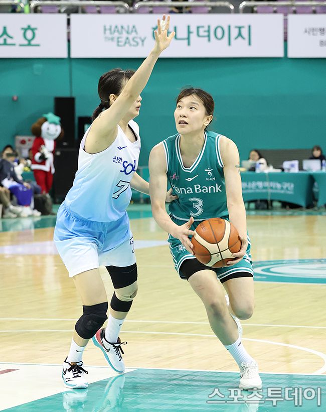 BNK금융 2025-2026 여자프로농구 부천 하나은행과 인천 신한은행의 경기가 26일 경기도 부천시 부천체육관에서 열렸다. 하나은행 정현이 골밑으로 돌파를 하고 있다. 2025.12.26. [스포츠투데이 권광일 기자 sports@stoo.com]