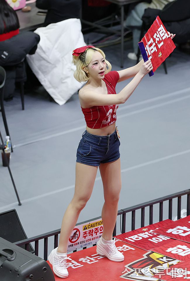 2025-2026 진에어 V-리그 남자부 한국전력-OK저축흔행 경기가 6일 경기 수원시 수원체육관에서 열렸다. 치어리더 박성은이 신나는 응원을 선보이고 있다. 2026.01.06. [스포츠투데이 권광일 기자 sports@stoo.com]