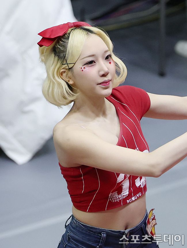 2025-2026 진에어 V-리그 남자부 한국전력-OK저축흔행 경기가 6일 경기 수원시 수원체육관에서 열렸다. 치어리더 박성은이 신나는 응원을 선보이고 있다. 2026.01.06. [스포츠투데이 권광일 기자 sports@stoo.com]
