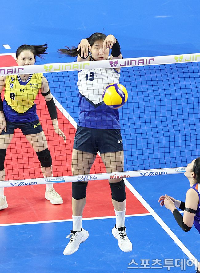 2025-2026 진에어 V-리그 여자부 IBK기업은행-현대건설 경기가 11일 경기도 화성시 화성종합경기타운에서 열렸다. 현대건설 정지윤이 네트를 넘어오는 공을 빠르게 처리하고 있다. 2026.01.11. [스포츠투데이 권광일 기자 sports@stoo.com]