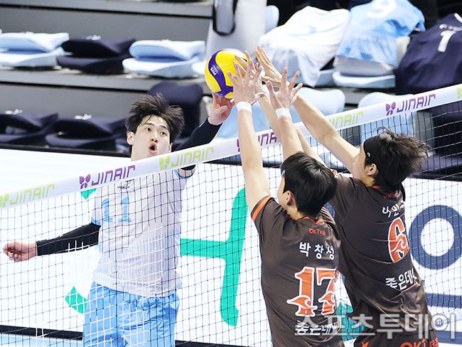 2025-2026 진에어 V-리그 남자부 대한항공-OK저축은행 경기가 13일 인천 계양체육관에서 열렸다. 대한항공 김선호가 네트에서 공을 밀어넣고 있다. 2026.01.13. [스포츠투데이 권광일 기자 sports@stoo.com]