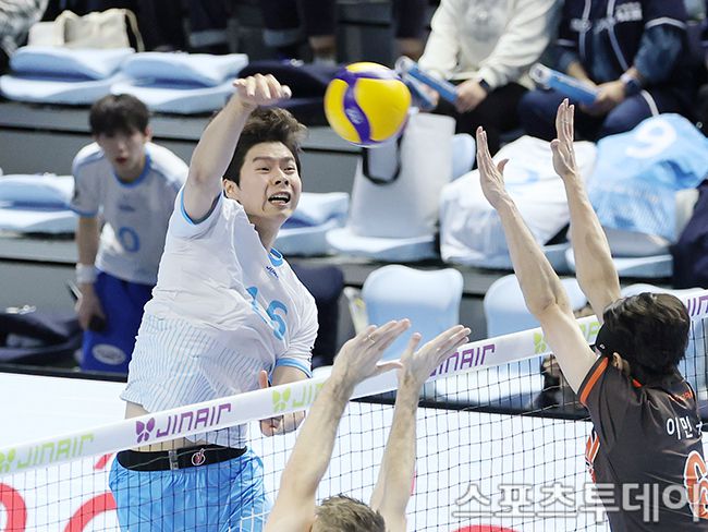 2025-2026 진에어 V-리그 남자부 대한항공-OK저축은행 경기가 13일 인천 계양체육관에서 열렸다. 대한항공 정한용이 스파이크를 때리고 있다. 2026.01.13. [스포츠투데이 권광일 기자 sports@stoo.com]