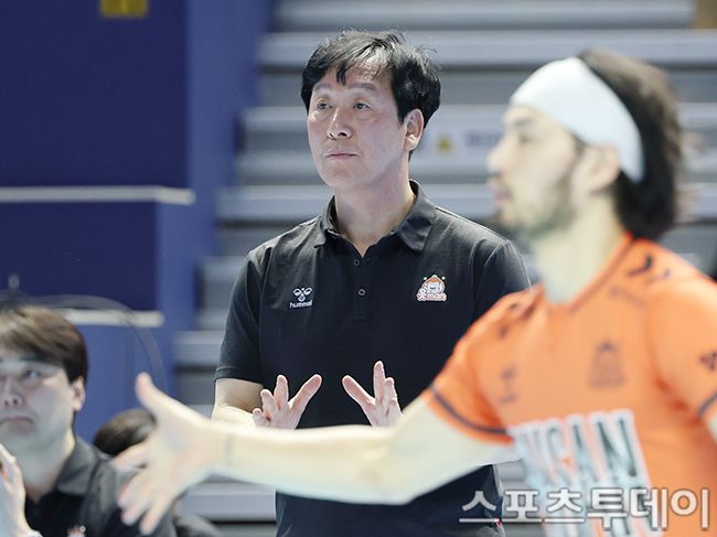 2025-2026 진에어 V-리그 남자부 대한항공-OK저축은행 경기가 13일 인천 계양체육관에서 열렸다. OK저축은행 신영철 감독이 선수들을 진정 시키고 있다. 2026.01.13. [스포츠투데이 권광일 기자 sports@stoo.com]
