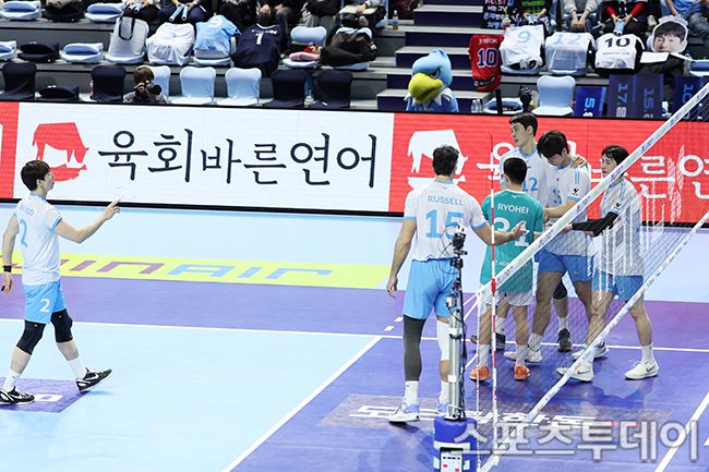 2025-2026 진에어 V-리그 남자부 대한항공-OK저축은행 경기가 13일 인천 계양체육관에서 열렸다. OK저축은행이 대한항공에 3-2 역전승을 하고 있다. 2026.01.13. [스포츠투데이 권광일 기자 sports@stoo.com]