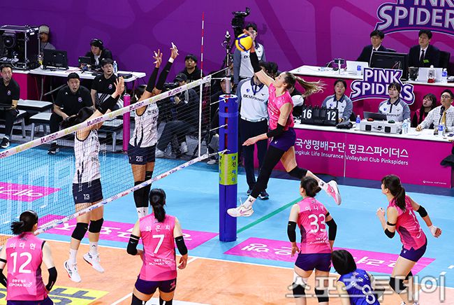 14일 인천 삼산월드체육관에서 열린 2025-2026 V리그 여자부 흥국생명과 한국도로공사의 경기, 흥국생명이 득점하고 있다. 2026.01.14. [스포츠투데이 팽현준 기자 sports@stoo.com]