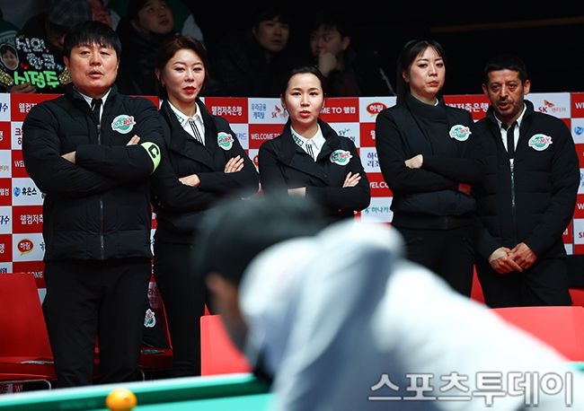 21일 경기도 고양 킨텍스 PBA스타디움에서 열린 '웰컴저축은행 PBA 팀리그 2025-2026' SK렌터카와 하나카드의 챔피언결정전 6차전, 1세트 하나카드 팀원들이 신정주의 플레이를 보고 있다. 2026.01.21. [스포츠투데이 팽현준 기자 sports@stoo.com]