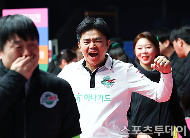 21일 경기도 고양 킨텍스 PBA스타디움에서 열린 '웰컴저축은행 PBA 팀리그 2025-2026' SK렌터카와 하나카드의 챔피언결정전 6차전에서 하나카드가 승리하며 최종스코어 4-2로 우승을 차지했다. 하나카드 선수들이 기뻐하고 있다. 2026.01.21. [스포츠투데이 팽현준 기자 sports@stoo.com]