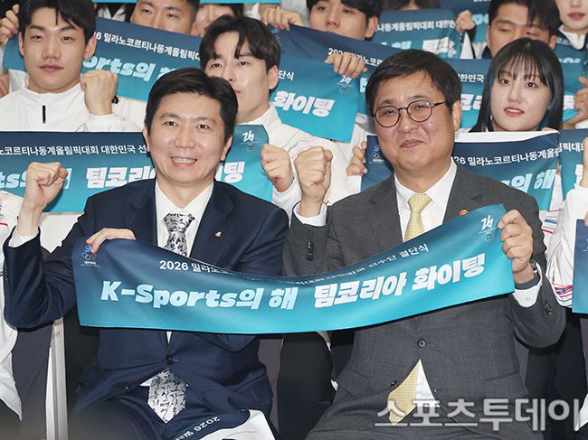 유승민 대한체육회장, 최휘영 문체부장관이 22일 오후 서울 송파구 방이동 서울올림픽파크텔에서 열린 2026 밀라노 코르티나 동계올림픽 대한민국 선수단 결단식에 참석해 파이팅 포즈를 취하고 있다. 2026.01.22. [스포츠투데이 권광일 기자 sports@stoo.com]