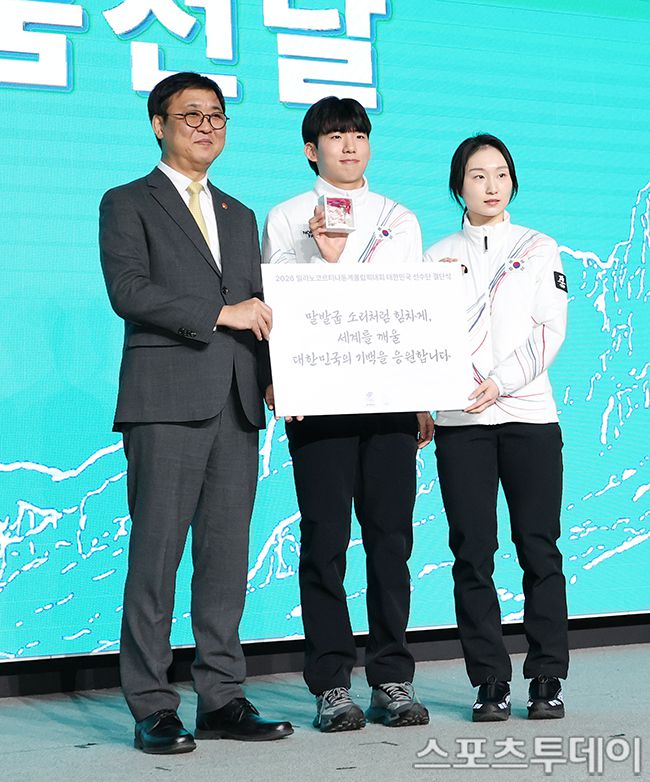최휘영 문체부장관, 정재원 선수, 최민정 선수가 22일 오후 서울 송파구 방이동 서울올림픽파크텔에서 열린 2026 밀라노 코르티나 동계올림픽 대한민국 선수단 결단식에 참석해 기념쵤영을 하고 있다. 2026.01.22. [스포츠투데이 권광일 기자 sports@stoo.com]