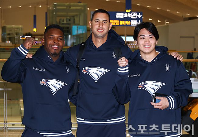 한화 이글스 페라자, 에르난데스, 왕옌천이 2026 시즌 준비 스프링캠프를 위해 23일 인천국제공항에서 출국을 준비하고 있다. 2026.01.23. [스포츠투데이 팽현준 기자 sports@stoo.com]