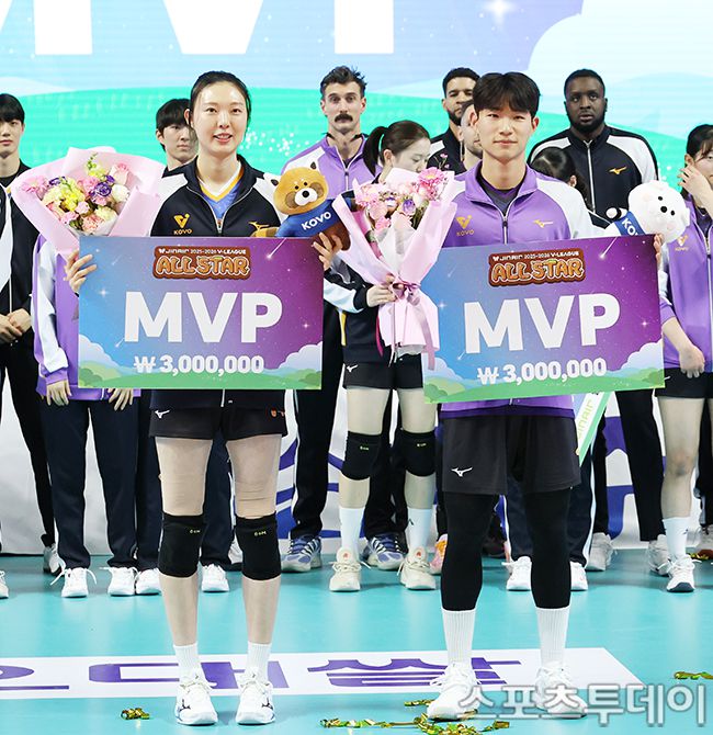 2025-2026 진에어 V-리그 올스타전 K스타와 V스타의 경기가 25일 강원 춘천시 호반체육관에서 열렸다. K스타 양효진, V스타 김우진이 올스타전에 출전해 MVP상을 수상하고 있다. 2026.01.25. [스포츠투데이 권광일 기자 sports@stoo.com]