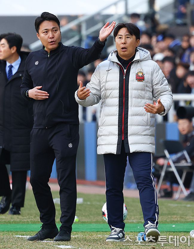 28일 오후 인천축구전용경기장에서 열린 '2026 K리그1' 인천 유나이티드와 FC서울의 경기, 서울이 2-1로 승리했다. 후반 추가시간이 주어지자 서울 김기동 감독이 이동준 심판에게 항의하고 있다. 2026.02.28. [스포츠투데이 팽현준 기자 sports@stoo.com]
