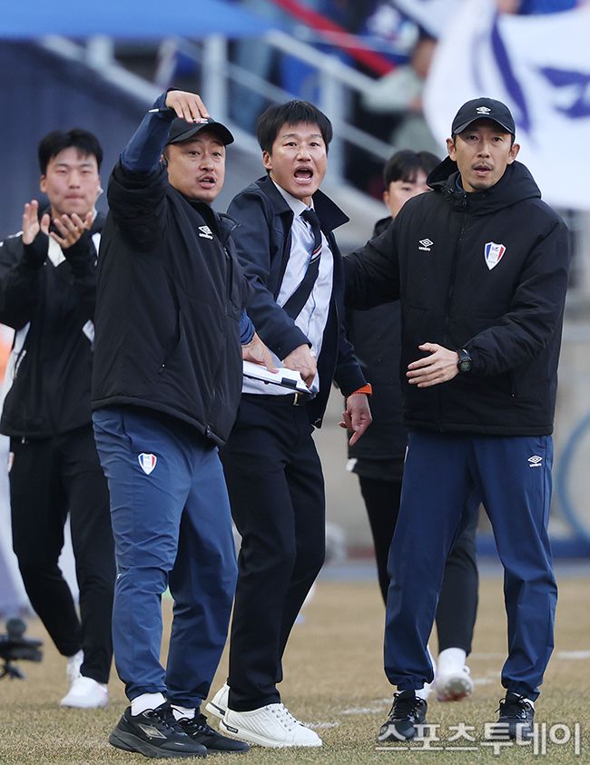 하나은행 K리그2 2026 수원삼성과 서울이랜드 경기가 28일 오후 수원월드컵경기장에서 열렸다. 수원삼성 이정효 감독이 전반전 1-1 동점을 만든 박현빈을 부르고 있다.2026.02.28. [스포츠투데이 권광일 기자 sports@stoo.com]
