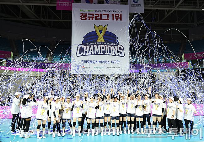 2025-2026 진에어 V-리그 여자부 흥국생명-한국도로공사 경기가 13일 인천 삼산월드체육관에서 열렸다. 도로공사 흥국생명을 상대로 세트스코어 3-0 스리를 하며 정규리그 1위를 차지며 기념촬영을 하고 있다. 2026.03.13. [스포츠투데이 권광일 기자 sports@stoo.com]