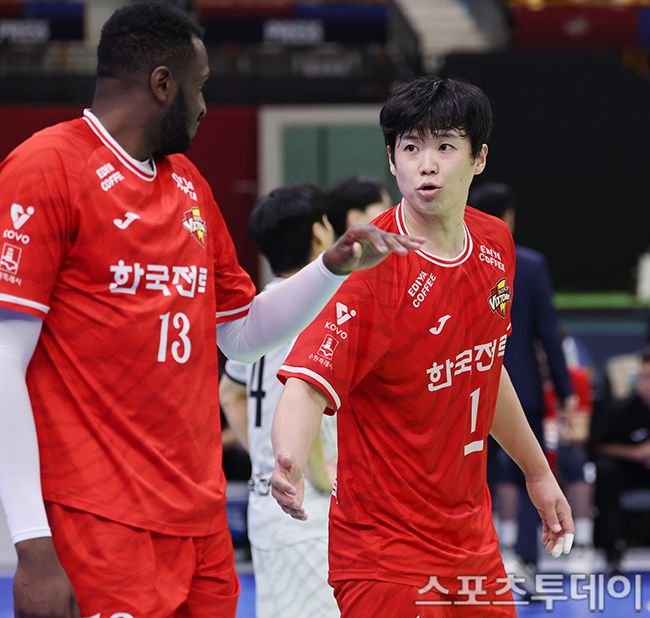 2025-2026 진에어 V-리그 남자부 한국전력-KB손해보험 경기가 18일 경기도 수원시 수원실내체육관에서 열렸다. 한국전력 서재덕이 베논과 하이파이브를 하고 있다. 2026.03.18. [스포츠투데이 권광일 기자 sports@stoo.com]