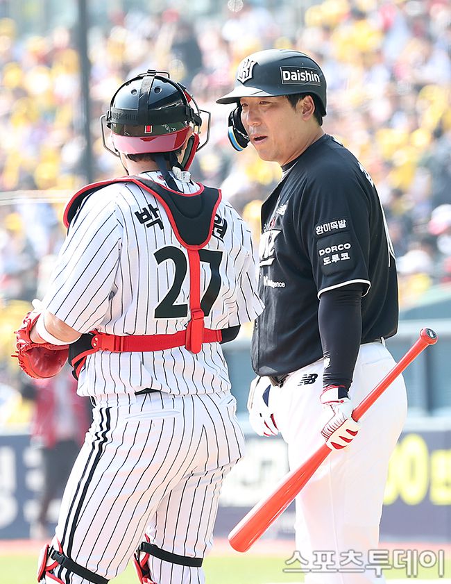2026 신한 SOL Bank KBO 리그 KT위즈와 LG트윈스의 경기가 28일 서울 잠실야구장에서 열렸다. LG 박동원, KT 김현수가 시구에 앞서 타석에서 이야기를 하고 있다. 2026.03.28. [스포츠투데이 권광일 기자 sports@stoo.com]