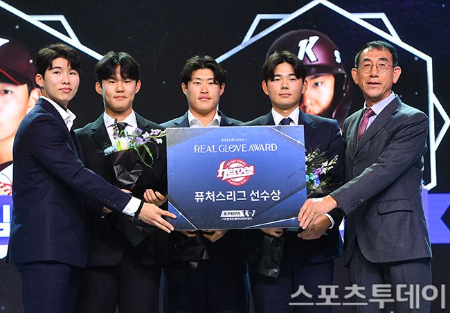 1일 서울 한남동 그랜드 하얏트 서울에서 열린 '2023 마구마구 리얼글러브 어워드'에서 키움 김동욱, 박찬혁, 주성원이 퓨처스리그 선수상을 받고 있다. 2023.12.01. [스포츠투데이 팽현준 기자 sports@stoo.com]