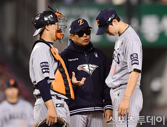 2025 신한은행 SOL Bank KBO리그 한화 이글스와 LG 트윈스의 경기가 26일 서울 잠실야구장에서 열렸다. 한화 양상문 코치, 이재원이 4회말 마운드로 올라와 엄상백과 대화를 하고 있다. 2025.03.26. [스포츠투데이 권광일 기자 sports@stoo.com]