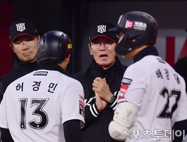 2025 신한은행 SOL Bank KBO리그 두산 베어스와 KT 위즈의 경기가 27일 경기 수원시 수원KT 위즈파크에서 열렸다. KT 이강철 감독이 득점한 허경민과 대화를 하고 있다. 2025.03.27. [스포츠투데이 권광일 기자 sports@stoo.com]