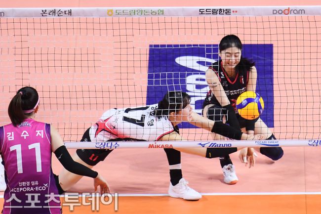 2024-2025 도드람 V-리그 여자부 챔피언 결정전 1차전이 흥국생명-정관장 경기가 31일 오후 경기도 인천시 삼산월드체육관에서 열렸다. 이날 정관장 정호영 박혜민 선수가 볼을 받아내고 있다. 2025.03.31. [스포츠투데이 안성후 기자 sports@stoo.com]