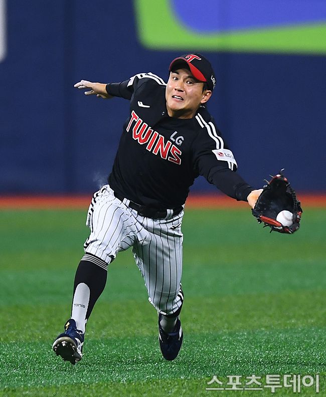 8일 서울 고척스카이돔에서 열린 2025 KBO리그 LG 트윈스와 키움 히어로즈의 경기, 8회말 무사 만루 LG 최원영이 키움 푸이그의 타루를 잡아내고 있다. 2025.04.08. [스포츠투데이 팽현준 기자 sports@stoo.com]