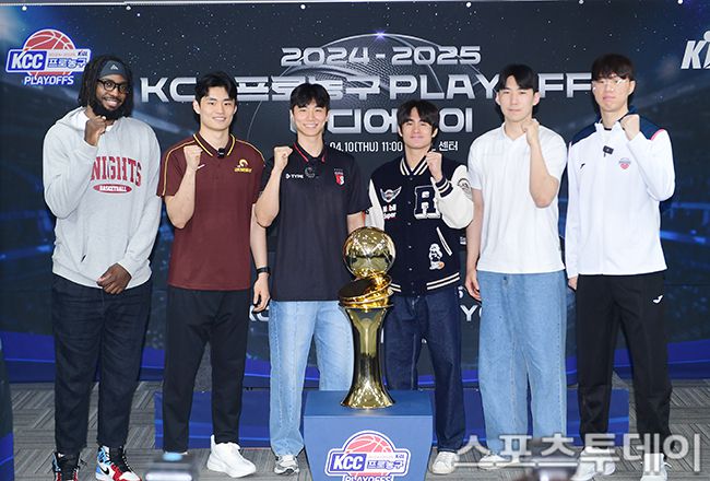 2024-2025 KCC 프로농구 플레이오프 미디어데이가 10일 서울 강남구 KBL센터에서 열렸다. 서울SK 자밀 워니, 창원LG 유기상, 안양 정관장 박지훈, 대구 한국가스공사 샘 조세프 벨란겔, 수원KT 문정현, 울산 현대모비스 이우석이 플레이오프 미디어데이에 참석해 포즈를 취하고 있다. 2025.04.10. [스포츠투데이 권광일 기자 sports@st