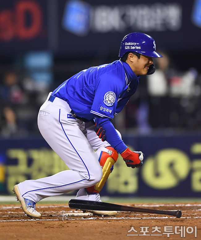 15일 서울 잠실야구장에서 열린 2025 KBO리그 삼성 라이온즈와 LG 트윈스의 경기, 6회 2사 삼성 이재현이 LG 에르난데스의 투구에 맞고 있다. 2025.04.15. [스포츠투데이 팽현준 기자 sports@stoo.com]