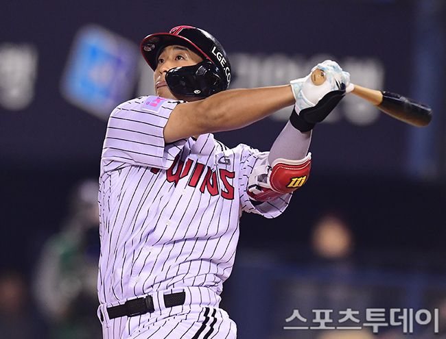 2025 신한은행 SOL Bank KBO리그 NC 다이노스와 LG 트윈스의 경기가 24일 서울 잠실야구장에서 열렸다. LG 송찬의가 9회말 1사에 안타를 치고 있다. 2025.04.24. [스포츠투데이 권광일 기자 sports@stoo.com]
