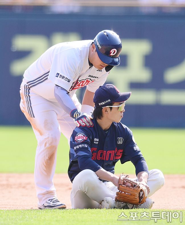 2025 신한은행 SOL Bank KBO리그 롯데 자이언츠와 두산 베어스의 경기가 26일 서울 잠실야구장에서 열렸다. 두산 김기연이 6회말 2루에서 롯데 전민재와 충돌한 후 미안함을 표시하고 있다. 2025.04.26. [스포츠투데이 권광일 기자 sports@stoo.com]