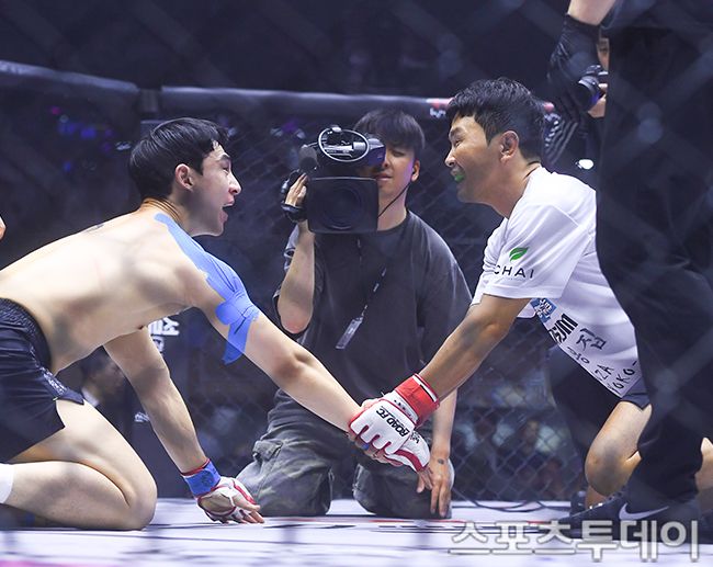 28일 서울 장충체육관에서 열린 로드FC 073 스페셜 이벤트 매치 윤형빈과 밴쯔의 경기, 윤형빈이 TKO 승리했다. 밴쯔와 윤형빈이 인사를 나누고 있다. 2025.06.28. [스포츠투데이 팽현준 기자 sports@stoo.com]