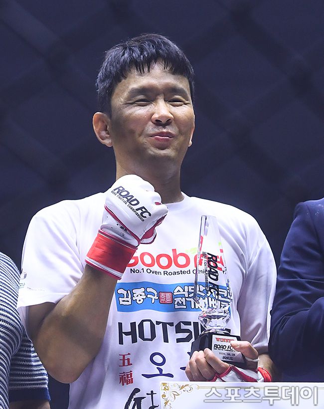 28일 서울 장충체육관에서 열린 로드FC 073 스페셜 이벤트 매치 윤형빈과 밴쯔의 경기, 윤형빈이 TKO 승리했다. 윤형빈이 트로피를 들고 포즈를 취하고 있다. 2025.06.28. [스포츠투데이 팽현준 기자 sports@stoo.com]