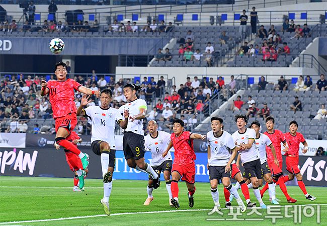 7일 용인미르스타디움에서 열린 2025 EAFF E-1 챔피언십(동아시안컵) 대한민국과 중국의 경기, 한국 박승욱이 헤더슛을 시도하고 있다. 2025.07.07. [스포츠투데이 팽현준 기자 sports@stoo.com]