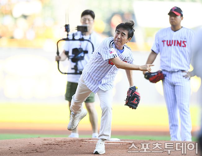10일 서울 잠실야구장에서 열린 2025 KBO리그 키움 히어로즈와 LG 트윈스의 경기, 배우 류승룡이 시구하고 있다. 2025.07.10. [스포츠투데이 팽현준 기자 sports@stoo.com]