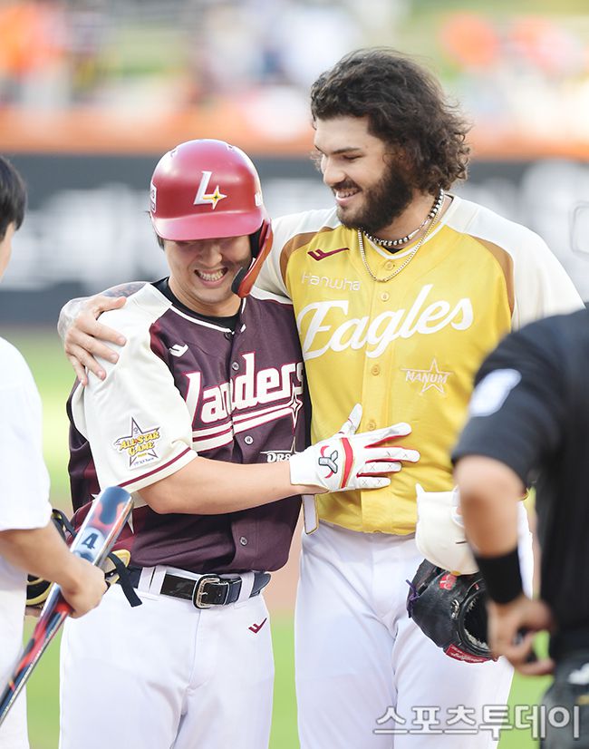 2025 신한은행 SOL Bank KBO 올스타 드림팀과 나눔팀의 경기가 12일 대전 한화생명볼파크에서 열렸다. 드림팀 최정과 나눔팀 폰세가가 1회초 웃으며 대화를 나누고 있다. 2025.07.12. [스포츠투데이 권광일 기자 sports@stoo.com]