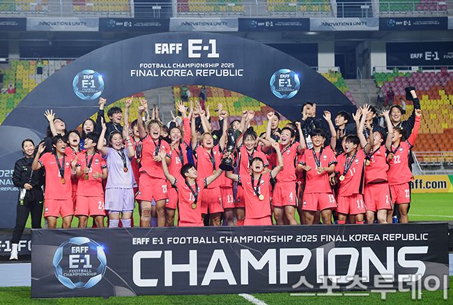 16일 수원월드컵경기장에서 열린 2025 EAFF E-1 챔피언십(동아시안컵) 대한민국과 대만의 경기가 열렸다. 대한민국 여자축구대표팀이 우승을 차지하고 우승 트로피들 받고 있다. 2025.07.16. [스포츠투데이 권광일 기자 sports@stoo.com]