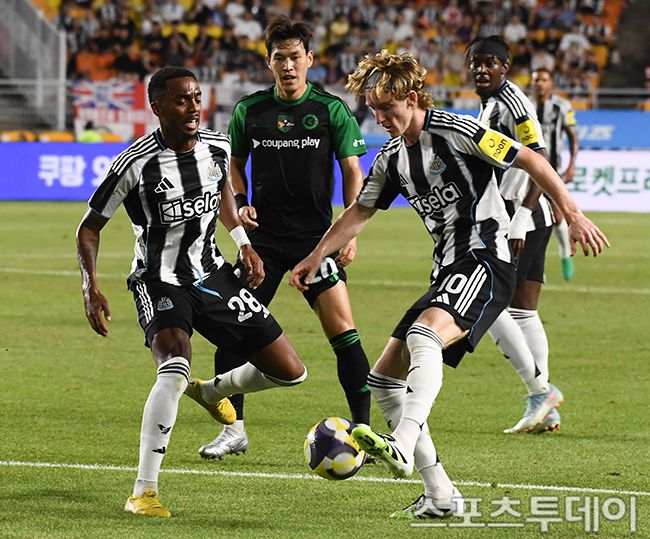 30일 수원월드컵경기장에서 열린 '2025 쿠팡플레이 시리즈' 팀 K리그와 뉴캐슬 유나이티드 FC의 경기, 전반 뉴캐슬 조 윌룩과 앤서니 고든이 공격하고 있다. 2025.07.30. [스포츠투데이 팽현준 기자 sports@stoo.com]