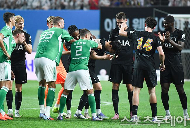 3일 서울월드컵경기장에서 열린 '2025 쿠팡플레이 시리즈' 토트넘 홋스퍼 FC와 뉴캐슬 유나이티드 FC의 경기, 후반 손흥민이 교체되며 동료들의 응원을 받고 있다. 2025.08.03. [스포츠투데이 팽현준 기자 sports@stoo.com]