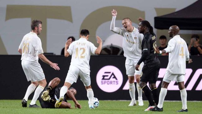 FC 스피어 호나우지뉴(아래)가 14일 서울 마포구 서울월드컵경기장에서 열린 2025 넥슨 아이콘매치 실드 유나이티드와의 경기에서 이영표의 반칙으로 넘어지고 있다. 서울월드컵=김두홍 기자 kimdh@sportsworldi.com # 김두홍 기자 kimdh@sportsworldi.com ⓒ 스포츠월드