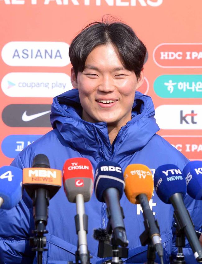 한국축구대표팀 오현규가 17일 고양종합운동장 보조경기장에서 2026 국제축구연맹(FIFA) 북중미 월드컵 아시아 3차 예선 오만전에 앞서 진행된 훈련에서 인터뷰를 하고 있다. 고양=김두홍 기자 kimdh@sportsworldi.com ⓒ 스포츠월드