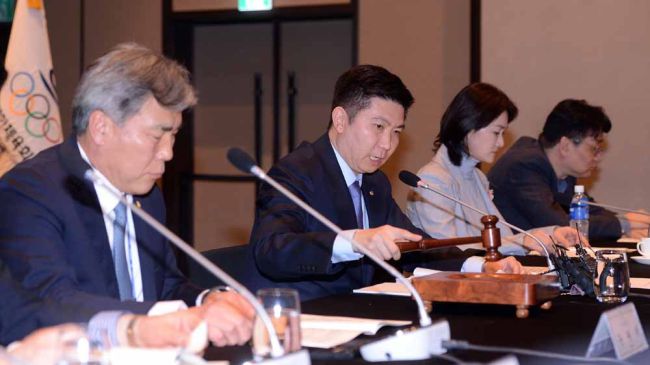유승민 대한체육회 신임회장(왼쪽에서 두번째)이 27일 서울 그랜드 하얏트 서울에서 열린 제1차 대한체육회 이사회에서 안건을 상정하고 있다. 사진=김두홍 기자 kimdh@sportsworldi.com ⓒ 스포츠월드