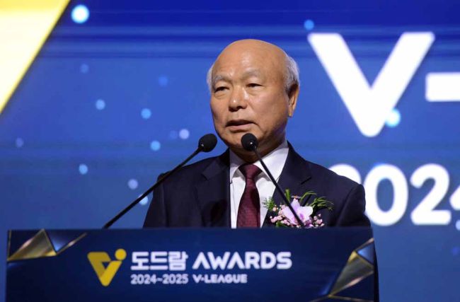 박광욱 도드람양돈협회 조합장이 14일 서울 서대문구 스위스 그랜드호텔에서 열린 '2024-2025 V리그 시상식' 에서 축사를 하고 있다. 사진=김두홍 기자 kimdh@sportsworldi.com ⓒ 스포츠월드