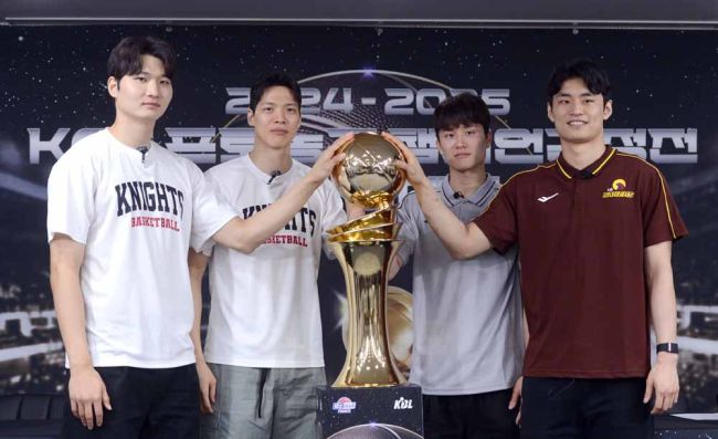 1일 서울 강남구 KBL센터에서 열린 '2024-2025 KCC프로농구 챔피언결정전 미디어데이'에서 양팀 선수들이 포즈를 취하고 있다. 서울 SK 안영준, 김선형, 창원 양준석, 유기상(왼쪽부터) 사진=김두홍 기자 kimdh@sportsworldi.com # 김두홍 기자 kimdh@sportsworldi.com ⓒ 스포츠월드