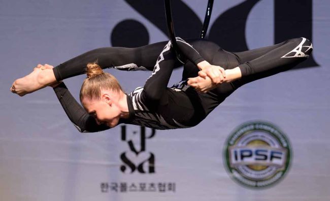 Ekaterina Shpilevskaia선수가 12일 경기도 화성시 동탄복합문화센터 반석아트홀에서 열린 2025한국폴스포츠선수권대회 및 2025국가대표선발전에서 연기를 선보이고 있다. 한국폴스포츠협회(회장 김진희)가 주최하고 국제폴스포츠연맹이 주관하는 2025한국폴스포츠선수권대회 및 2025국가대표선발전은 폴스포츠, 아티스틱폴, 에어리얼후프, 아티스틱후프,
