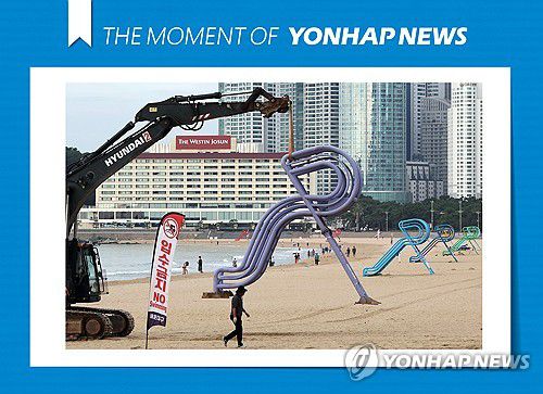 (부산=연합뉴스) 강선배 기자 = 15일 부산 해운대구청 관계자들이 해운대백사장에서 중장비로 망루를 철거하고 있다. 해운대구는 8월에 종료하는 해수욕장을 9월 늦더위로 올해는 보름 더 연장해 지난 14일 폐장했다. 2025.9.15 [THE MOMENT OF YONHAPNEWS] sbkang@yna.co.kr ▶제보는 카카오톡 okjebo ▶연합뉴스 앱 지